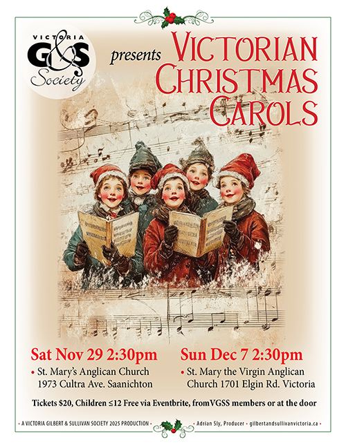 Victorian Christmas Carols will be held at St. Mary's in Oak Bay, November 29th and St. Mary's in Saanichton, December 7 at 2:30pm. Rehearsals will be at St. Mary's in Oak Bay on Sundays November 9, 16, 23 from 2-4pm with Music Director and Accompanist, Curt Bergen.